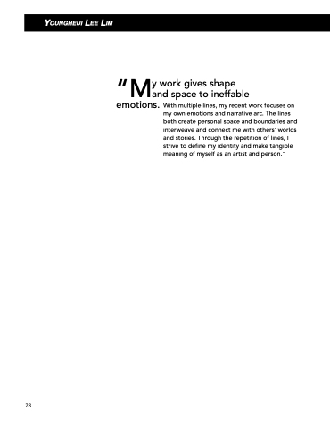 both create personal space and boundaries and interweave and connect me with others’ worlds and stories. Through the repetition of lines, I strive to define my identity and make tangible meaning of myself as an artist and person.”