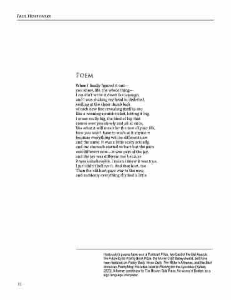 Hostovsky’s poems have won a Pushcart Prize, two Best of the Net Awards, the FutureCycle Poetry Book Prize, the Muriel Craft Bailey Award, and have been featured on Poetry Daily, Verse Daily, The Writer’s Almanac, and the Best American Poetry blog. His latest book is Pitching for the Apostates (Kelsay, 2023). A former contributor to The Woven Tale Press, he works in Boston as a sign language interpreter.