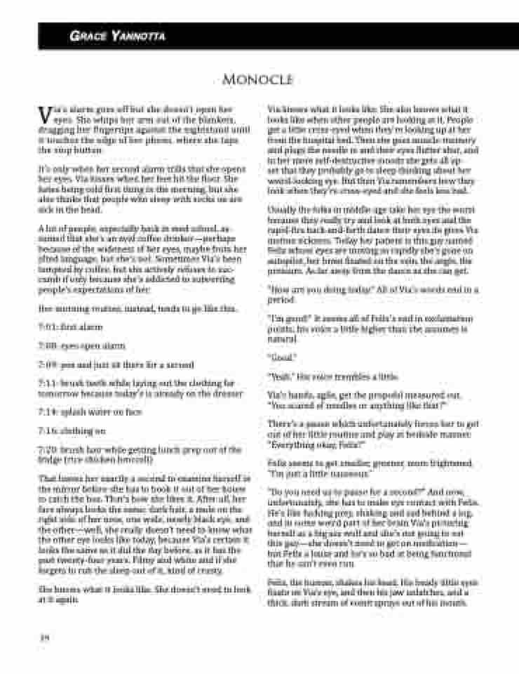 That leaves her exactly a second to examine herself in the mirror before she has to book it out of her house to catch the bus. That’s how she likes it. After all, her face always looks the same; dark hair, a mole on the right side of her nose, one wide, nearly black eye, and the other—well, she really doesn’t need to know what the other eye looks like today, because Via’s certain it looks the same as it did the day before, as it has the past twenty-four years. Filmy and white and if she forgets to rub the sleep out of it, kind of crusty.