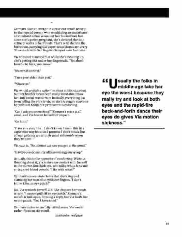 HR, Via reminds herself. HR. She chooses her words wisely. “I cannot pull off an eye patch.” Xiomara’s mouth is half-open, forming a reply, but Via beats her to the punch. “Yes, I have tried.”