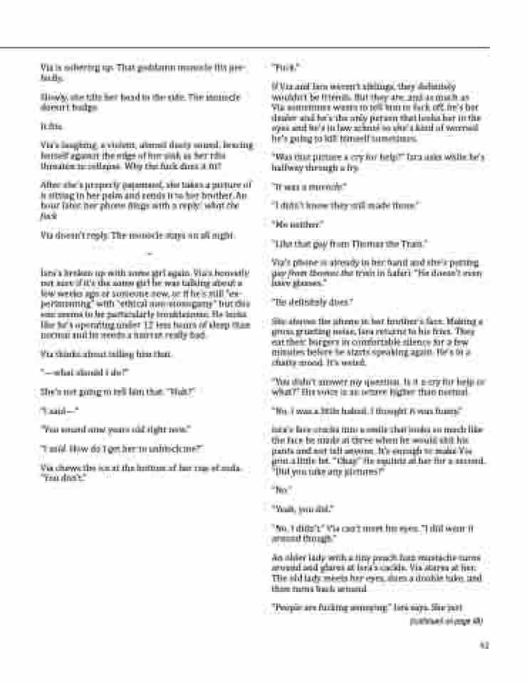 If Via and Isra weren’t siblings, they definitely wouldn’t be friends. But they are, and as much as Via sometimes wants to tell him to fuck off, he’s her dealer and he’s the only person that looks her in the eyes and he’s in law school so she’s kind of worried he’s going to kill himself sometimes.