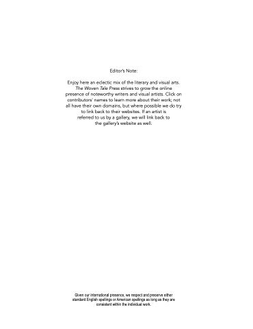 Enjoy here an eclectic mix of the literary and visual arts. The Woven Tale Press strives to grow the online presence of noteworthy writers and visual artists. Click on contributors' names to learn more about their work; not all have their own domains, but where possible we do try to link back to their websites. If an artist is referred to us by a gallery, we will link back to