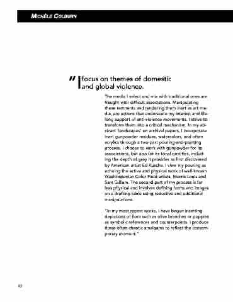 The media I select and mix with traditional ones are fraught with difficult associations. Manipulating these remnants and rendering them inert as art me- dia, are actions that underscore my interest and life- long support of anti-violence movements. I strive to transform them into a critical mechanism. In my ab- stract 'landscapes’ on archival papers, I incorporate inert gunpowder residues, watercolors, and often acrylics through a two-part pouring-and-painting process. I choose to work with gunpowder for its associations, but also for its tonal qualities, includ- ing the depth of grey it provides as first discovered by American artist Ed Ruscha. I view my pouring as echoing the active and physical work of well-known Washingtonian Color Field artists, Morris Louis and Sam Gilliam. The second part of my process is far less physical and involves defining forms and images on a drafting table using reductive and additional manipulations.