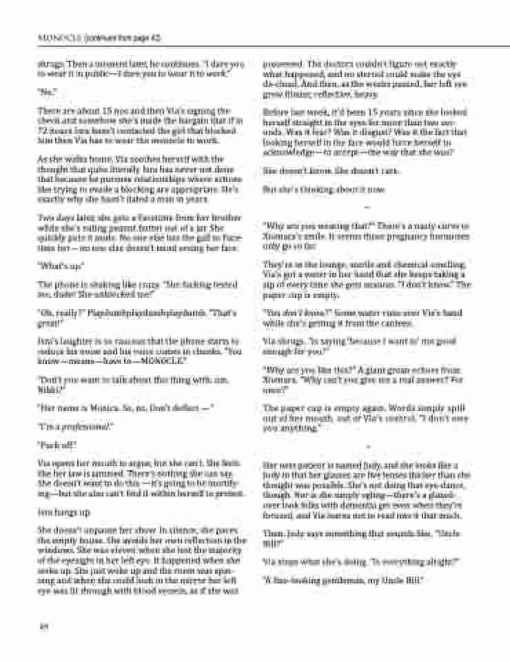She doesn’t unpause her show. In silence, she paces the empty house. She avoids her own reflection in the windows. She was eleven when she lost the majority of the eyesight in her left eye. It happened when she woke up. She just woke up and the room was spin- ning and when she could look in the mirror her left eye was lit through with blood vessels, as if she was