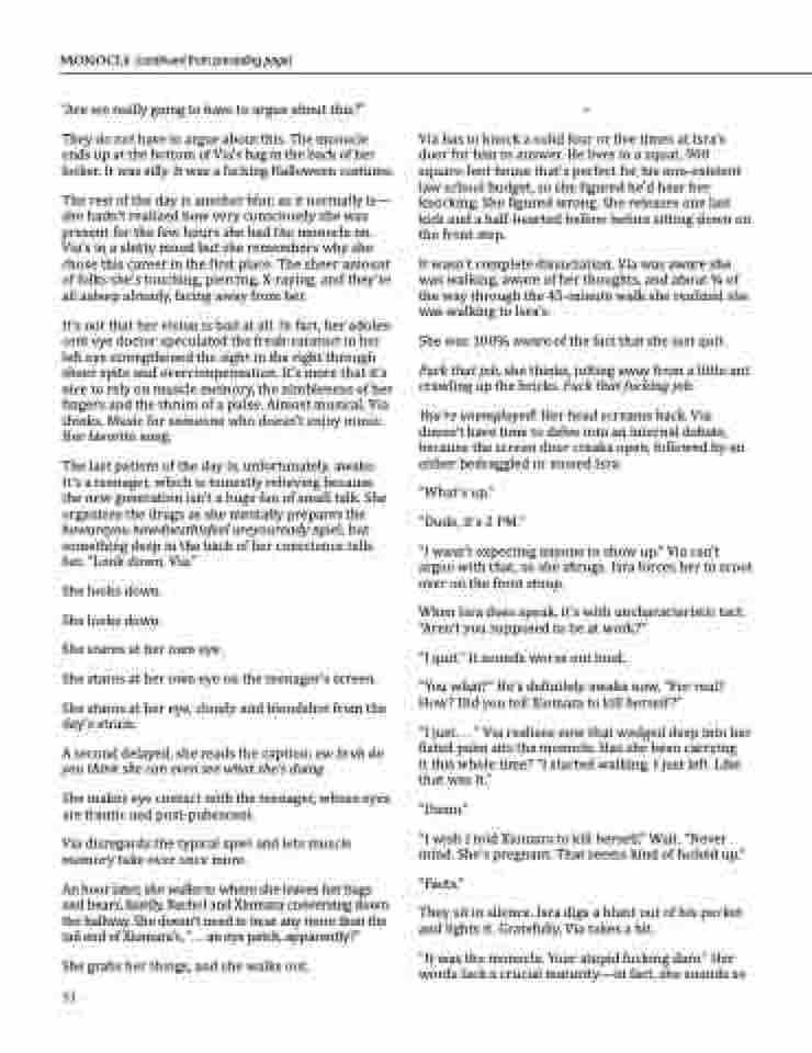 It’s not that her vision is bad at all. In fact, her adoles- cent eye doctor speculated the freak-cataract in her left eye strengthened the sight in the right through sheer spite and overcompensation. It’s more that it’s nice to rely on muscle memory, the nimbleness of her fingers and the thrum of a pulse. Almost musical, Via thinks. Music for someone who doesn’t enjoy music. Her favorite song.
