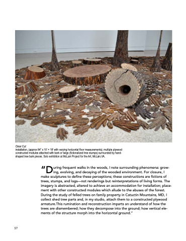 make sculptures to define these perceptions; these constructions are fictions of trees, stumps, and logs—not renderings but reinterpretations of living forms. The imagery is abstracted, altered to achieve an accommodation for installation; place- ment with other constructed modules which allude to the abuses of the forest. During the study of felled trees on family property in Catuctin Mountains, MD, I collect shed tree parts and, in my studio, attach them to a constructed plywood armature.This rumination and reconstruction imparts an understand of how the trees are dismembered; how they decompose into the ground; how vertical ele- ments of the structure morph into the horizontal ground.”