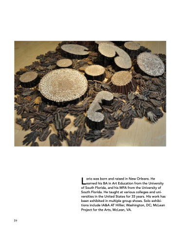 Lorio was born and raised in New Orleans. He earned his BA in Art Education from the University of South Florida, and his MFA from the University of South Florida. He taught at various colleges and uni- versities in the United States for 33 years. His work has been exhibited in multiple group shows. Solo exhibi- tions include IA&A AT Hillier, Washington, DC; McLean Project for the Arts, McLean, VA.