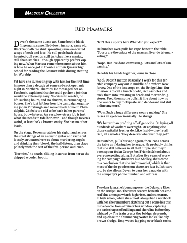 Yet here she is, meeting up with him for the first time in more than a decade at some sad-sack open mic night in Northern Liberties. He messaged her on Facebook, explained that he could get her a job that would be extremely easy. No crises to resolve, no life-sucking hours, and no abusive, micromanaging bosses. She’s just left her horrible campaign organiz- ing job in Pittsburgh and moved back home to Phila- delphia. 26 feels too old to be back in her parents’ house, but whatever. An easy, low-stress job is just what she needs to tide her over—and though Deven’s weird, at least he’s a known entity. She has no other leads.