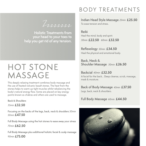 This deeply relaxing treatment combines body massage and the use of heated volcanic basalt stones. The heat from the stones helps to warm up tight muscles whilst rebalancing the body’s natural energy flow. Some are placed on key energy points known as chakras and others are used to massage.