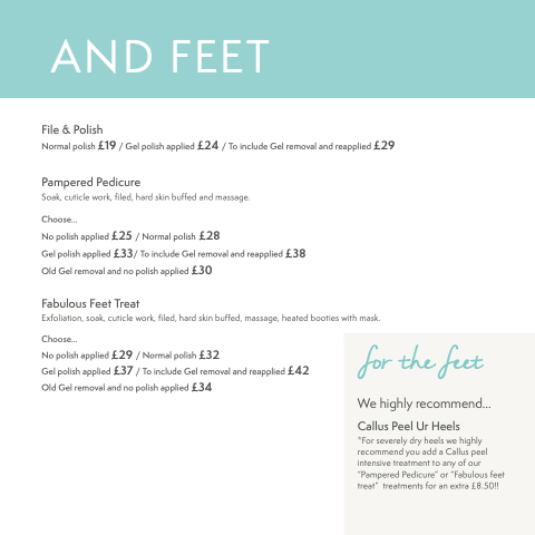 *For severely dry heels we highly recommend you add a Callus peel intensive treatment to any of our “Pampered Pedicure” or “Fabulous feet treat” treatments for an extra £8.50!!