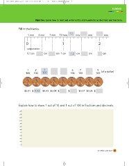 Explain how to show 1 out of 10 and 1 out of 100 in fractions and decimals.