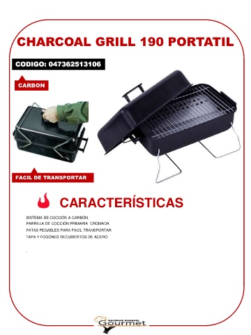 CHARCOAL GRILL 190 PORTATIL CODIGO: 047362513106 CARBON FACIL DE TRANSPORTAR CARACTERÍSTICAS SISTEMA DE COCCIÓN A CARBÓN. PARRILLA DE COCCIÓN PRIMARIA CROMADA PATAS PEGABLES PARA FACIL TRANSPORTAR TAPA Y FOGONES RECUBIERTOS DE ACERO .