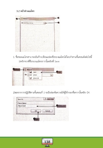 3.2 หน้ำต่ำงแมโคร 1. ชื่อของแมโครสามารถบันทึกเปลี่ยนแปลงชื่อของแมโครได้โดยทําตามขั้นตอนดังต่อไปนี้ 1)คลิกขวาที่ชื่อของแมโครจากนั้นคลิกที่ Save 2)ผลจากการปฏิบัติตามขั้นตอนที่ 1 จะมีกล่องข้อความให้ผู้ใช้กรอกชื่อจากนั้นคลิก OK 138
