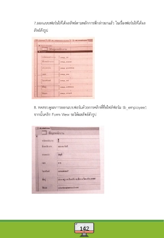 7.ออกแบบฟอร์มให้ได้ผลลัพธ์ตามหลักการที่กล่าวมาแล้ว ในเรื่องฟอร์มให้ได้ผล ลัพธ์ดังรูป 8. ทดสอบดูผลการออกแบบฟอร์มด้วยการคลิกที่ชื่อไฟล์ฟอร์ม tb_employee1 จากนั้นคลิก Form View จะได้ผลลัพธ์ดังรูป 142