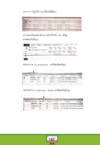 14.จากการปฏิบัติการจะได้ผลลัพ์ดังรูป 15.ทดลองรันแมโครด้วยการคลิกที่คําสั่ง Run เพื่อดู ผลลัพธ์จะได้ดังรูป *คลิกตาราง tb_employee จะได้ผลลัพธ์ดังรูป *คลิกคิวรี tb_employee Query จะได้ผลลัพธ์ดังรูป 145