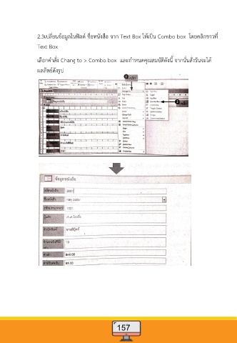 2.3เปลี่ยนข้อมูลในฟิลด์ ชื่อหนังสือ จาก Text Box ให้เป็น Combo box โดยคลิกขาวที่ Text Box เลือกคําสั่ง Chang to > Combo box และกําหนดคุณสมบัติดังนี้ จากนั่นสั่งรันจะได้ ผลลัพธ์ดังรูป 157