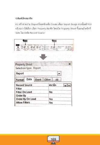 4.พิมพ์บัตรสมำชิก 4.1 สร้างรายงาน (Report)โดยคลิกแท็บ Create เลือก Report Design จากนั้นคลิกขวา บริเวณว่างให้เลือก เลือก Property สมาชิก โดยเปิด Property Sheet ขึ้นมาแล้วคลิกที่ Date ในบรรทัด Record Source 169