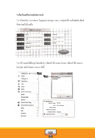 7.เรียกใบเสร็จจำกฟอร์มกำรเช่ำ 7.1 เปิดฟอร์ม FormRent ในมุมมอง Design view วางปุ่มคําสั่ง ลงในฟอร์ม พิมพ์ ข้อความเป็นใบเสร็จ 7.2 สร้างแมครใส่ในปุ่ม โดยคลิกขวาเลือกคําสั่ง build Event เลือกคําสั่ง Macro Builder แล้วกําหนด macro ดังนี้ 168