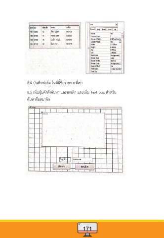 8.4 บันทึกฟอร์ม ในที่นี้ชื่อรายการที่เช่า 8.5 เพิ่มปุ่มคําสั่งค้นหา และยกเลิก และเพิ่ม Text box สําหรับ ค้นหาชื่อสมาชิก 171