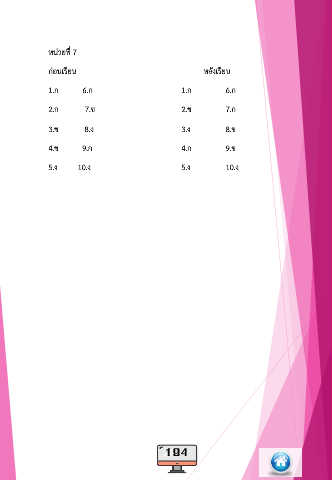 หน่วยที่ 7 ก่อนเรียน หลังเรียน 1.ก 6.ก 1.ก 6.ก 2.ก 7.ข 2.ข 7.ก 3.ข 8.ง 3.ง 8.ข 4.ข 9.ก 4.ก 9.ข 5.ง 10.ง 5.ง 10.ง 194