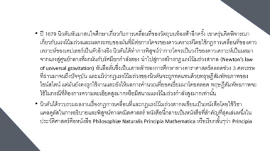 • ปี 1679 นิวตันหันมาสนใจศึกษาเกี่ยวกับการเคลื่อนที่ของวัตถุบนท้องฟ้าอีกครั้ง เขาครุ่นคิดพิจารณา