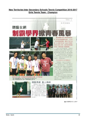 New Territories Inter Secondary Schools Tennis Competition 2016-2017 Girls Tennis Team - Champion 體路 MARCH 21, 2017 Media – Sports 46