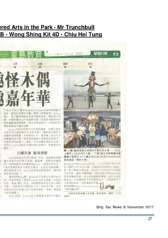 th Sing Tao News 17 Standard Chartered Arts in the Park - Mr Trunchbull 4E - Lui Cheuk Yiu 4F - So Wing Lam 4B - Wong Shing Kit 4D - Chiu Hei Tung Sing Tao News 8 November 2017 Media – Arts 27