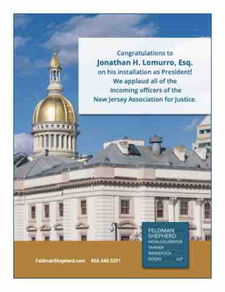Congratulations to Jonathan H. Lomurro, Esq. on his installation as President! We applaud all of the incoming officers of the New Jersey Association for Justice. FeldmanShepherd.com 856.444.5291