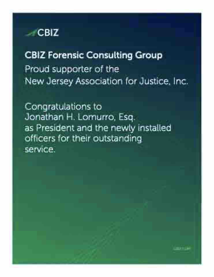 CBIZ Forensic Consulting Group Proud supporter of the New Jersey Association for Justice, Inc. Congratulations to Jonathan H. Lomurro, Esq. as President and the newly installed officers for their outstanding service.