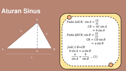 Aturan Sinus C ∆ ; sin = = sin b = sin a ∆ ; sin = CR = sin = sin , R=CR A B R sin = sin c = … (1) sin sin