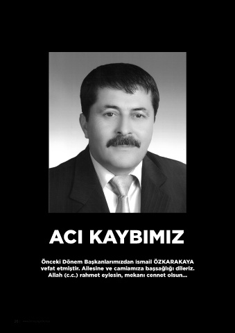 ACI KAYBIMIZ Önceki Dönem Başkanlarımızdan İsmail ÖZKARAKAYA vefat etmiştir. Ailesine ve camiamıza başsağlığı dileriz. Allah (c.c.) rahmet eylesin, mekanı cennet olsun... 26 www.mmo.org.tr/konya