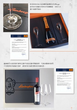 杯底具有內嵌式玻璃雕刻藍寶堅尼品牌logo, 使用時不因雕刻而降低手接觸觸感,同時大大 提升高腳杯質感。 藍寶堅尼水晶玻璃杯提供紅酒杯和氣泡酒杯兩種選擇,可讓消費者在飲用 不同酒款使用適當的酒杯,讓酒的特性達到更好的味蕾表現。 26