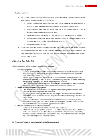 realise they can repay the loan. 80% of the KwaZulu Natal pilot repaid the loan in less than