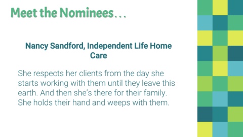 Meet the Nominees… Nancy Sandford, Independent Life Home Care She respects her clients from the day she starts working with them until they leave this earth. And then she’s there for their family. She holds their hand and weeps with them.