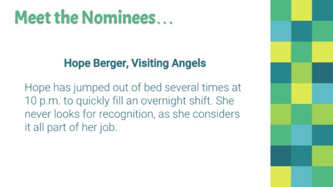 Meet the Nominees… Hope Berger, Visiting Angels Hope has jumped out of bed several times at 10 p.m. to quickly fill an overnight shift. She never looks for recognition, as she considers it all part of her job.