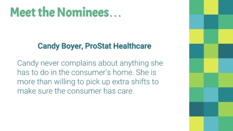 Meet the Nominees… Candy Boyer, ProStat Healthcare Candy never complains about anything she has to do in the consumer's home. She is more than willing to pick up extra shifts to make sure the consumer has care.