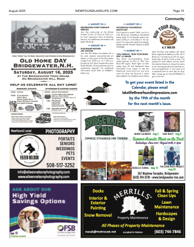 To get your event listed in the Calendar, please email lakelife@newfoundimpressions.com by the 19th of the month