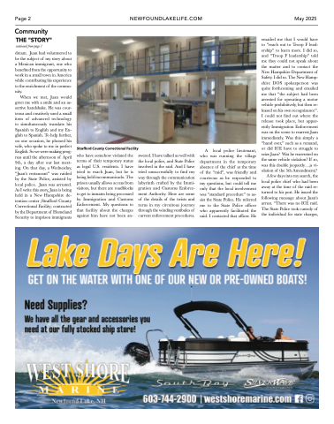 When we met, Juan would greet me with a smile and an as- sertive handshake. He was cour- teous and creatively used a small item of advanced technology to simultaneously translate his Spanish to English and my En- glish to Spanish. To help further, on one occasion, he phoned his wife, who spoke to me in perfect English. So we were making prog- ress until the afternoon of April 9th, a day after our last meet- ing. On that day, a Wednesday, “Juan’s restaurant” was raided by the State Police, assisted by local police. Juan was arrested. As I write this story, Juan is being held in a New Hampshire de- tention center (Strafford County Correctional Facility) contracted by the Department of Homeland Security to imprison immigrants
