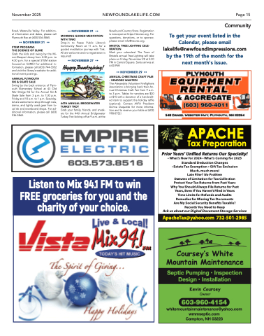 To get your event listed in the Calendar, please email lakelife@newfoundimpressions.com by the 19th of the month for the next month's issue.