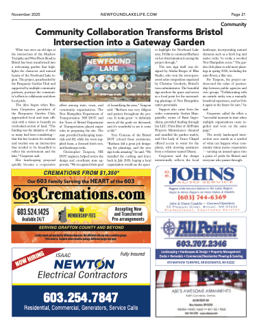 The idea began when Bar- bara Carpenter, president of the Pasquaney Garden Club, approached local and state offi- cials with a vision to beautify an overlooked section of land. “The funding was the initiative of what so many had been considering— that this key location for residents and tourists was an intersection that needed to be beautified to reflect the environment and the lake,” Carpenter said.