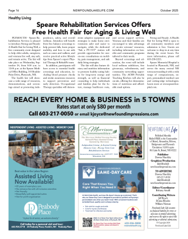 PLYMOUTH – Speare Re- habilitation Services is pleased to introduce Strong and Steady: A Health Fair for Living Well, a free community event designed to help older adults, caregivers, and veterans live well, stay safe, and remain active. The fair will take place on Wednesday, Sep- tember 24, from 9:00 a.m. to 12:00 p.m. at the Speare Medi- cal Office Building, 103 Boulder Point Drive, Plymouth, NH.
