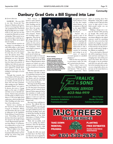DANBURY—The year 2025 is one that 18-year-old Tess Sumner of Danbury will remem- ber for a very long time. She not only graduated from Newfound Regional High School as valedic- torian of her class but was also accepted into Harvard on a merit scholarship. What started out as her senior project ended up as a bill that Gov. Kelly Ayotte signed into law in July.
