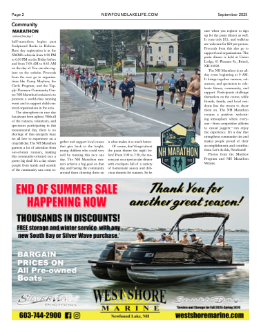 The NH Marathon is an all- day event beginning at 9 AM. It brings together runners, vol- unteers, and spectators to cele- brate fitness, community, and support. Participants challenge themselves on the course, while friends, family, and local resi- dents line the streets to cheer them on. The NH Marathon creates a positive, welcom- ing atmosphere where every- one—from competitive athletes to casual joggers—can enjoy the experience. It’s a day that strengthens community ties and makes people proud of their accomplishments and contribu- tions. Let’s do this, Newfound!