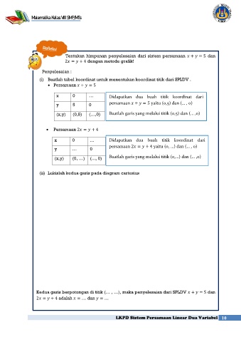 Kedua garis berpotongan di titik (… , …), maka penyelesaian dari SPLDV + = 5 dan