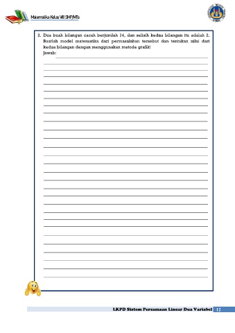 2. Dua buah bilangan cacah berjumlah 14, dan selisih kedua bilangan itu adalah 2.