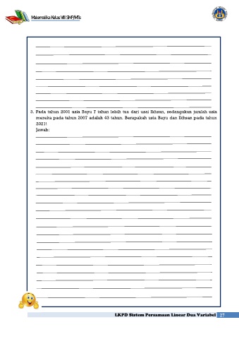 3. Pada tahun 2001 usia Bayu 7 tahun lebih tua dari usai Ikhsan, sedangakan jumlah usia
