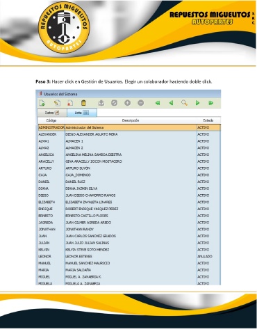 Paso 3: Hacer click en Gestión de Usuarios. Elegir un colaborador haciendo doble click.