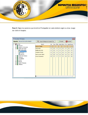 Paso 5: Eliges las opciones que tendrá el Trabajador en cada módulo según su área. Luego dar click en Aceptar.