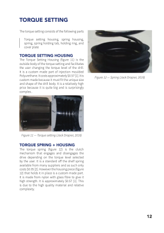 The torque spring (figure 12) is is is the the clutch mechanism that engages engages and disengages the the the drive depending on the the the the torque level selected by the the the user It is a a a a a a a a a standard off the the the shelf spring available from many suppliers and and as such only costs $0 05 [2] However the housing piece (figure 12) that holds it it it in in place is is a a a a a a a custom made made part It It is is is is made made from nylon with glass fibre to to give it it it high high strength It It is is is is approximately $0 57 [1] This is is is due to the high high quality material and relative complexity Figure 12 — Spring (Jack Drapier 2016)