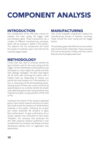 Two of of the the analysed components utilised the the manufacturing process of of injection moulding These include the the outer casing and the the trigger button The The planetary gears identified as low end carbon steel steel and the shaft milled steel steel These processes will now be discussed in in detail with any custom features also thoroughly examined 15